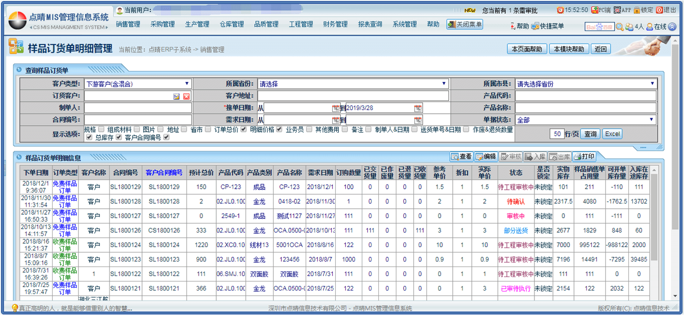 功能特點:點晴ERP系統(tǒng)提供了區(qū)別于量產(chǎn)的樣品管理模塊,用于記錄樣品信息:包括樣品分類、條形碼、產(chǎn)品批號、中英文品名、外銷價格、樣品數(shù)量、樣品庫存庫位、樣本圖片、樣品借出/借入、完整的樣品跟蹤記錄以及交貨提醒等。