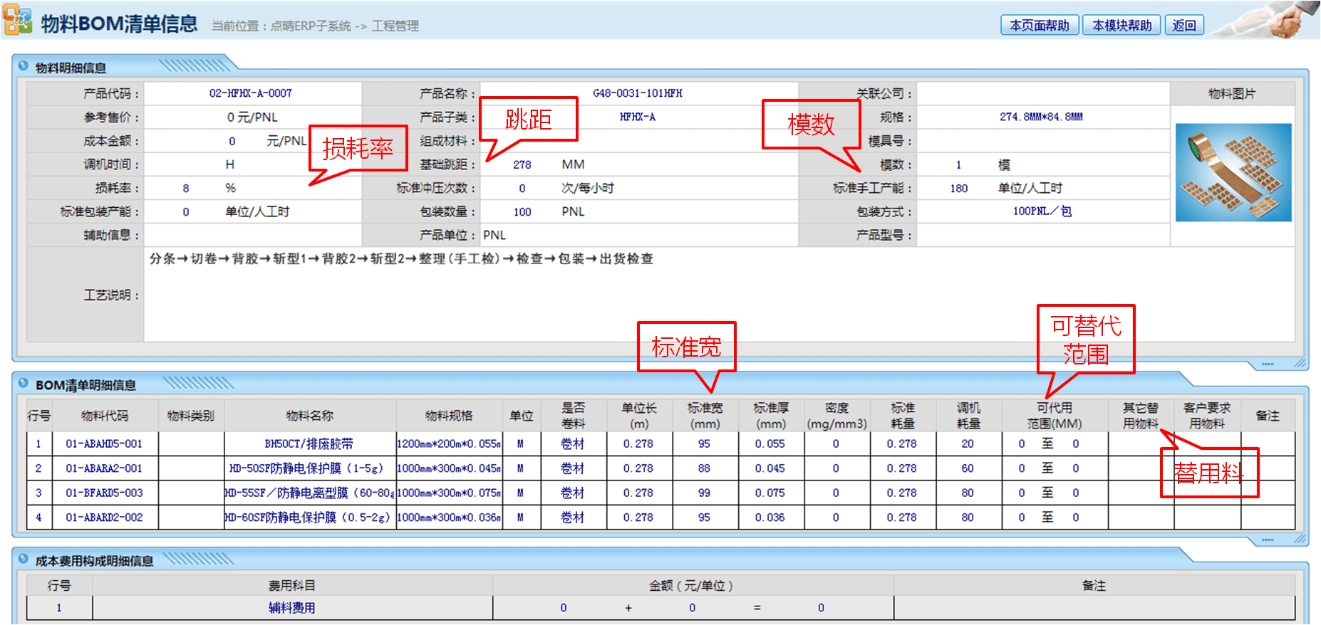 設(shè)計理念:常規(guī)ERP必須指定實際物料唯一編碼,但模切行業(yè)物料是基于寬度、跳距決定的,所以常規(guī)ERP的BOM清單在模切行業(yè)完全無效,造成后續(xù)的原材料管理失控,更談何成本核算,因此BOM工程料的引入能有效從根源解決原材料管控問題。