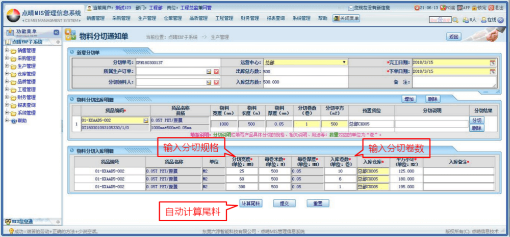設(shè)計理念:常規(guī)ERP由于物料編碼唯一性,卷料分切分條后規(guī)格變化會造成基礎(chǔ)屬性全部丟失,因此只能用于管訂單,管不了物料,并且容易面臨大量無法識別屬性的尾料堆積倉庫或車間,因此引入分切管理是模切行業(yè)的核心解決方案。