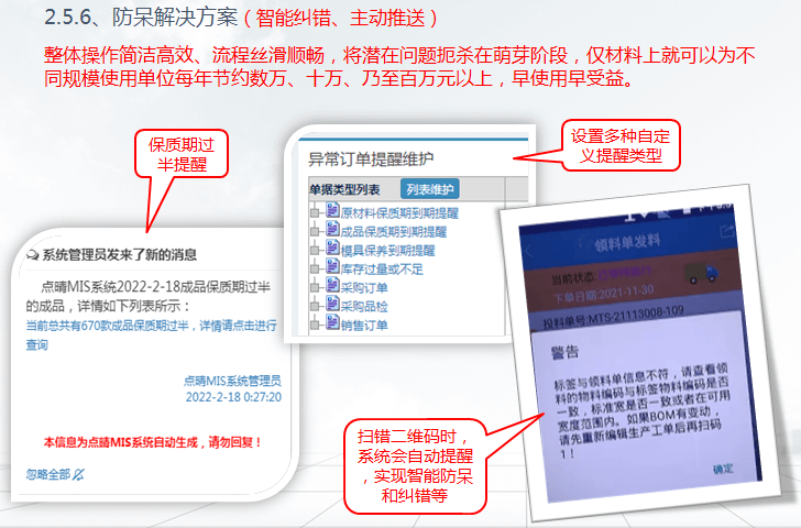 功能特點:點晴ERP系統(tǒng),采用先進(jìn)先出(FIFO)的原則通過掃碼發(fā)料自動提醒倉庫人員所發(fā)材料是否符合生產(chǎn)分切要求。通過智能算料備料形成最優(yōu)分切計劃,智能計算缺料防止過量采購。系統(tǒng)預(yù)設(shè)原材料保質(zhì)期到期提前提醒,實時關(guān)注材料保質(zhì)期狀況。
