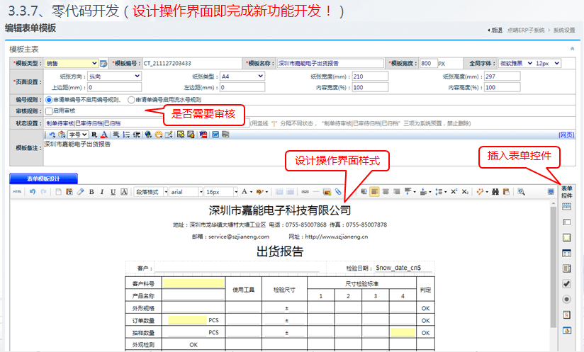 特別說明:零代碼是指無需通過軟件商對ERP系統(tǒng)后臺編程開發(fā)重打包,用戶自行在前臺WEB頁面設(shè)計出表單,放入相應(yīng)輸入框控件,并視情況添加必要JS腳本,就完成了程序設(shè)計。
